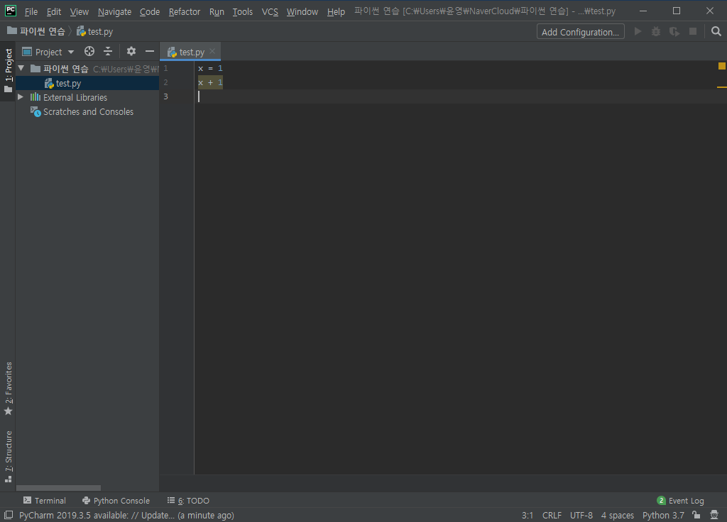 x + 1을 입력한 후 enter를 누르더라도 그 결과인 2가 출력되지 않습니다. 소스 코드 전체를 실행시키려면 상단 메뉴 바의 Run-Run 'test' 또는 Run-Run...을 클릭하거나 단축키 alt + shift + F10을 누르면 코드를 실행할 수 있습니다.