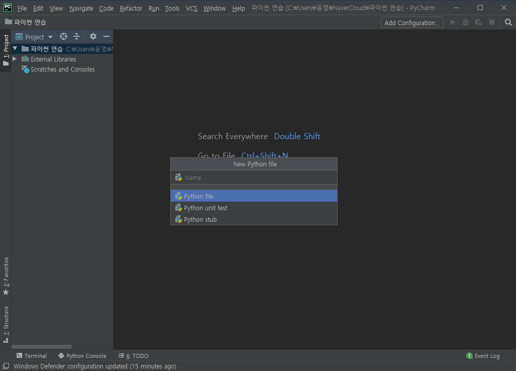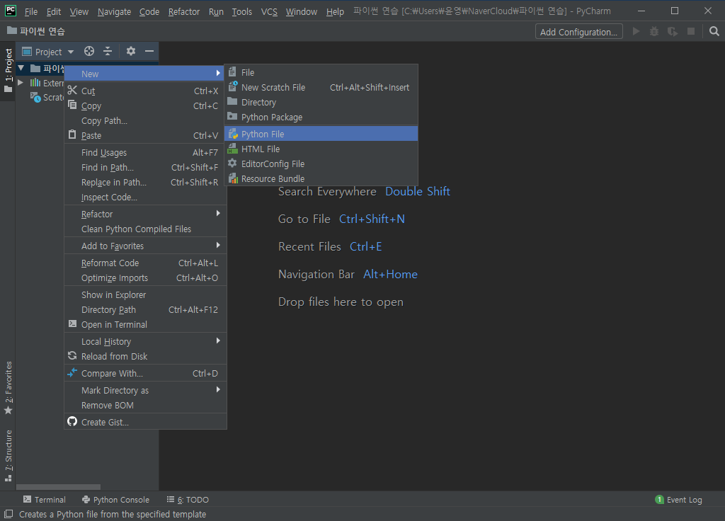 좌측 Project 탭에서 본인이 설정한 프로젝트 폴더(저는 '파이썬 연습' 폴더로 설정했습니다.)를 우클릭한 뒤 New - Python File을 클릭합니다.