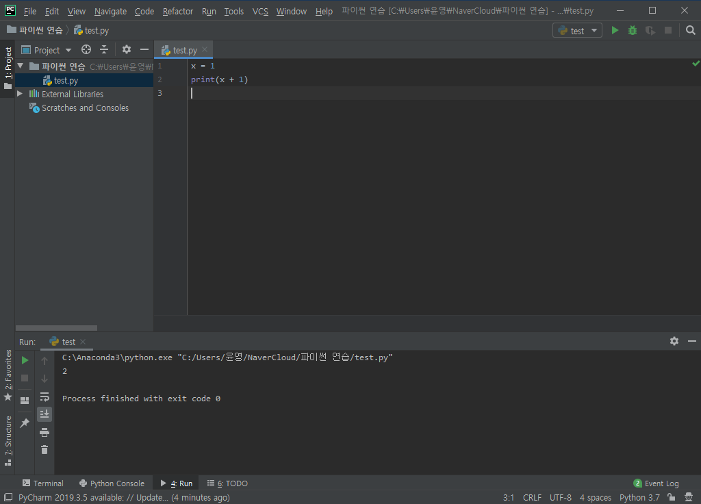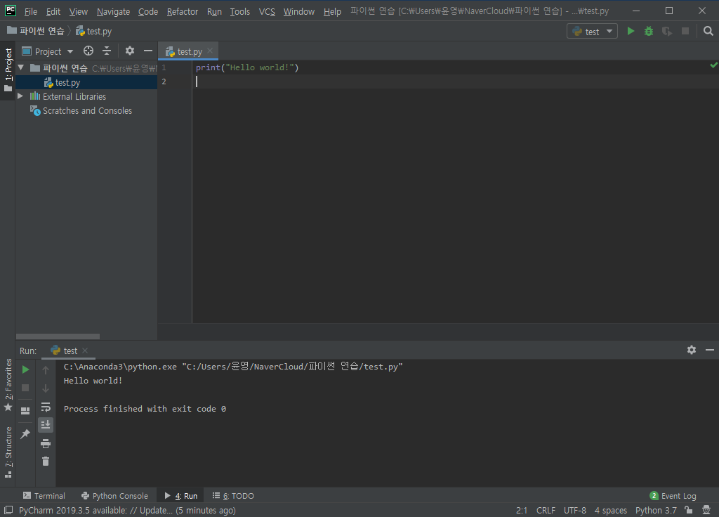 x + 1 부분을 출력에 해당하는 print(x + 1)로 바꾸어 ctrl + shift + F10으로 코드를 작동시키면 하단의 결과에서 2라는 숫자를 확인할 수 있게 됩니다. 프로그래밍 공부 시작의 기본이 되는 Hello world!를 출력하기 위해서는 다음을 입력하면 됩니다.