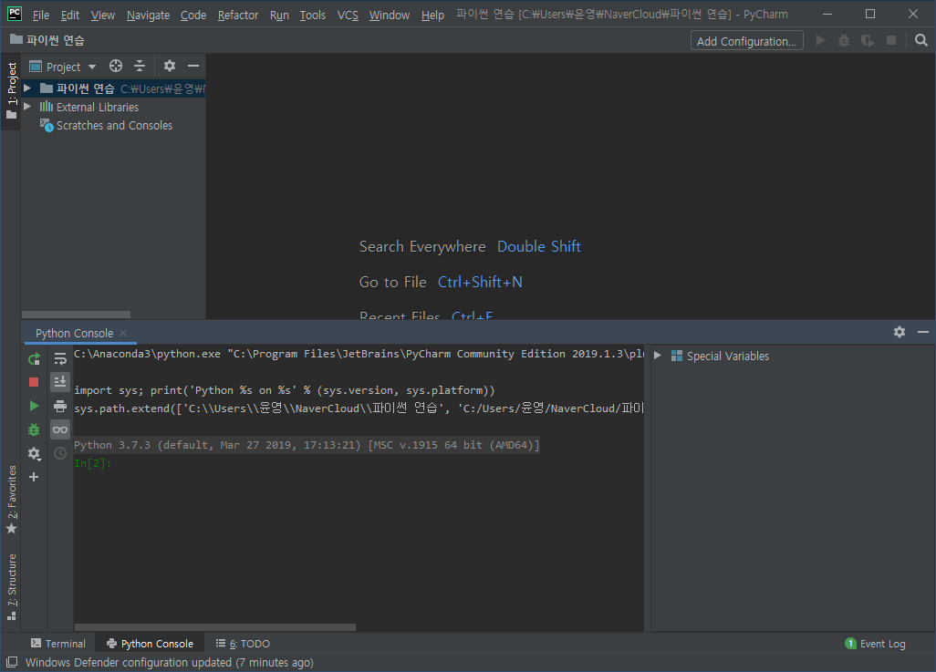 파이참에서 대화형 인터프리터를 사용하기 위해서는 위와 같이 좌측 하단의 Python Console을 클릭하면 됩니다.