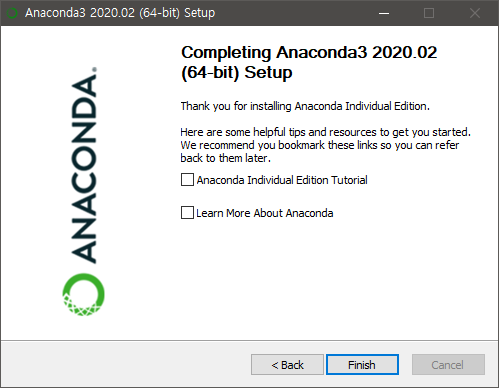 “PATH 환경 변수에 Anaconda를 추가할 지 여부를 선택하십시오.” - PATH 환경 변수 내 다른 소프트웨어를 방해할 수 있으므로 Anaconda를 추가하지 않는 것이 좋습니다. 대신 시작 메뉴에서 Anaconda Navigator 또는 Anaconda Prompt를 열어 Anaconda 소프트웨어를 사용하십시오. |