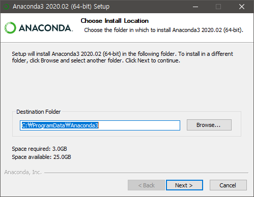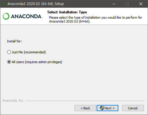 All Users를 선택할 경우 os에 접속된 계정에 관계 없이 이용할 수 있도록 설치가 됩니다. (설치 경로: C\Program Data\Anaconda3)