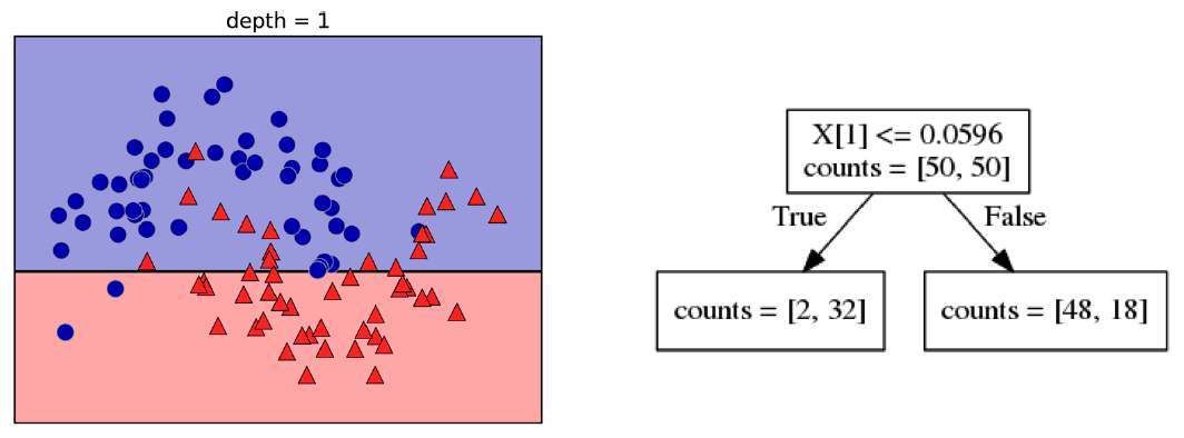 데이터 셋을 x[1]=0.0596을 기준으로 수직으로 나누는 것이 가장 많은 정보를 제공합니다. 다시 말해 class 0의 데이터 포인트들을 class 1의 데이터 포인트로부터 가장 잘 분리합니다. 가장 위의 노드(node)를 root라 하며 전체 데이터 셋을 대표합니다. 즉, class 0에 속한 75개의 데이터 포인트와 class 1에 속한 75개의 데이터 포인트로 구성되어 있습니다. test가 True라면 해당 데이터 포인트는 왼쪽 노드로 할당되며 False라면 오른쪽 노드로 할당됩니다. 왼쪽 노드는 class 0에 속한 두 개의 데이터 포인트와 class 1에 속한 32개의 데이터 포인트를 포함합니다. 오른쪽 노드는 class 0에 속한 48개의 데이터 포인트와 class 1에 속한 18개의 데이터 포인트를 포함합니다. 이 두 노드는 위의 그림의 상단과 하단에 해당되며 하단 영역에는 여전히 class 0에 속한 데이터 포인트가 있으며 상단 영역에도 여전히 class 1에 속한 데이터 포인트가 있습니다. 좀 더 정확한 모델은 최선의 test를 각 영역에서 찾는 행위를 반복함으로써 얻어질 수 있습니다. 다음의 그림은 다음으로 이뤄진 가장 유익한 분리를 보여줍니다.