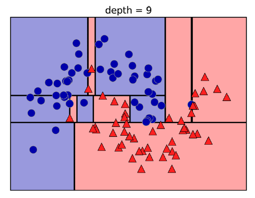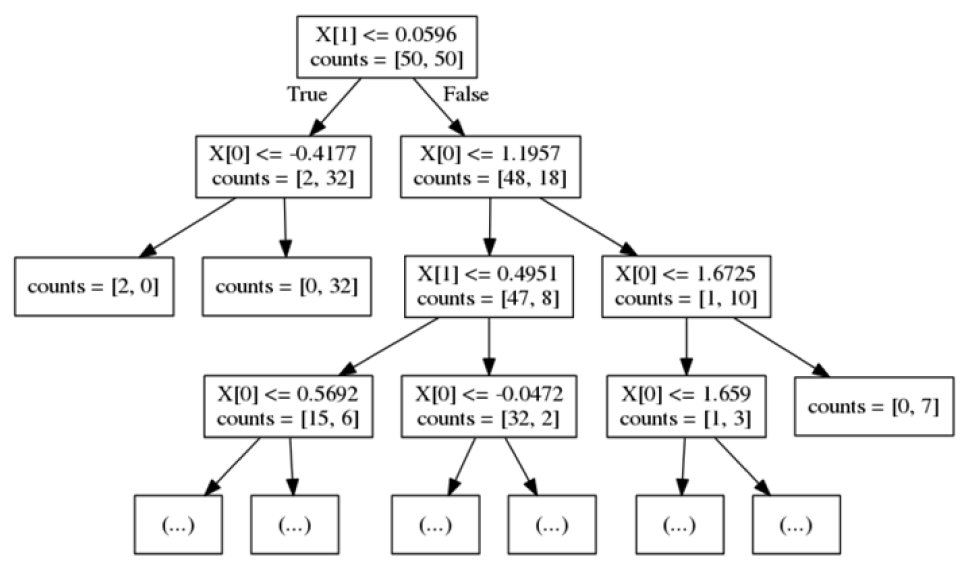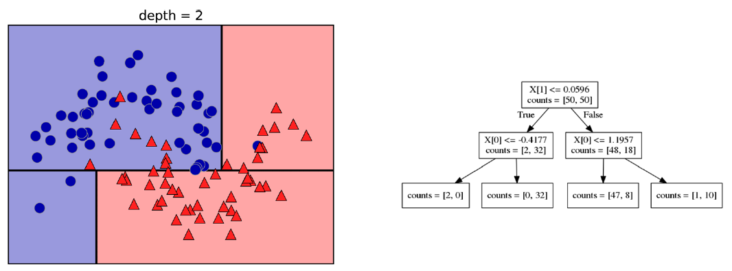 이러한 반복적인 과정은 결정들로 이뤄진 이진 트리를 만들게 되며, 각 노드는 test를 포함하게 됩니다. 이 과정은 각 영역이 오직 한 목표값(단일 class 또는 단일 회귀값)을 포함할 때까지 반복됩니다. 오직 같은 목표값만을 공유하도록 만들어진 영역을 ‘pure’하다고 합니다. 최종 결과는 다음의 그림에서 확인할 수 있습니다.