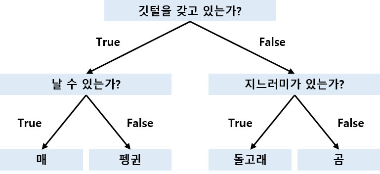 결정 트리(decision tree)는 분류와 회귀에 널리 사용되는 모델로 마치 스무고개처럼 어떠한 결정에 이르는 if/else 제어문들의 계층구조를 학습합니다. 예를 들어 매, 펭귄, 돌고래, 곰을 구분하는 질문 트리를 구성해봅시다.