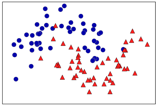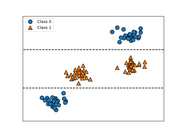 위의 그래프는 두 개의 특성과 두 개의 class를 갖는 데이터 셋을 보여줍니다. 모든 정보는 x[1]에 담겨있으며, x[0]은 전혀 사용되지 않습니다. 그러나 x[1]과 output class 사이의 관계는 단조롭지만은 않습니다. 이를 두고 “높은 값의 x[0]이 class 0을 의미하며 낮은 값의 x[0]은 class 1을 의미한다”고 말할 수 없습니다.