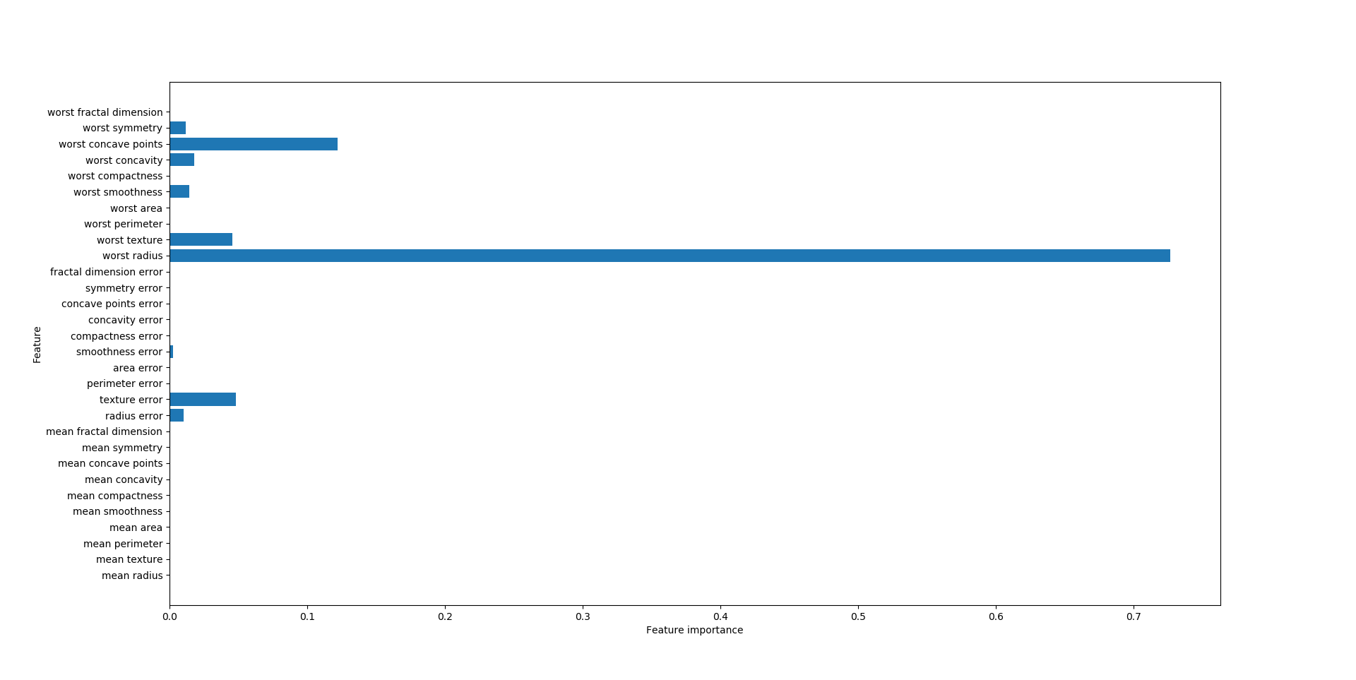 | from sklearn.datasets import load_breast_cancer cancer = load_breast_cancer() from sklearn.model_selection import train_test_split X_train, X_test, y_train, y_test = train_test_split(cancer.data, cancer.target, stratify=cancer.target, random_state=42) from sklearn.tree import DecisionTreeClassifier tree = DecisionTreeClassifier(max_depth=4, random_state=0) tree.fit(X_train, y_train) def plot_feature_importances_cancer(model): n_features = cancer.data.shape[1] plt.barh(range(n_features), model.feature_importances_, align='center') plt.yticks(np.arange(n_features), cancer.feature_names) plt.xlabel("Feature importance") plt.ylabel("Feature") plot_feature_importances_cancer(tree) plt.show() |