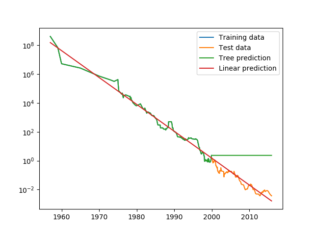 | import os ram_prices = pd.read_csv(os.path.join(mglearn.datasets.DATA_PATH, "ram_price.csv")) # use historical data to forecast prices after the year 2000 data_train = ram_prices[ram_prices.date < 2000] data_test = ram_prices[ram_prices.date >= 2000] # predict prices based on data X_train = data_train.date[:, np.newaxis] # we use a log-transform to get a simpler relation of data to target y_train = np.log(data_train.price) from sklearn.tree import DecisionTreeRegressor tree = DecisionTreeRegressor().fit(X_train, y_train) from sklearn.linear_model import LinearRegression linear_reg = LinearRegression().fit(X_train, y_train) # predict on all data X_all = ram_prices.date[:, np.newaxis] pred_tree = tree.predict(X_all) pred_lr = linear_reg.predict(X_all) # undo log-transform price_tree = np.exp(pred_tree) price_lr = np.exp(pred_lr) plt.semilogy(data_train.date, data_train.price, label="Training data") plt.semilogy(data_test.date, data_test.price, label="Test data") plt.semilogy(ram_prices.date, price_tree, label="Tree prediction") plt.semilogy(ram_prices.date, price_lr, label="Linear prediction") plt.legend() plt.show() |