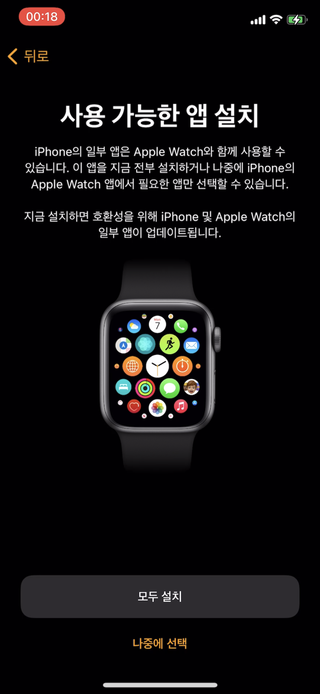 본인에게 맞게 설정을 하시고 나면 사용 가능한 앱 설치 화면이 나오게 됩니다. 아이폰의 앱스토어에 있는 앱 중에는 아이폰과 워치를 모두 지원하는 앱이 있습니다. 아이폰에 해당 앱이 설치되어 있다면 애플워치에도 동일하게 설치됩니다.