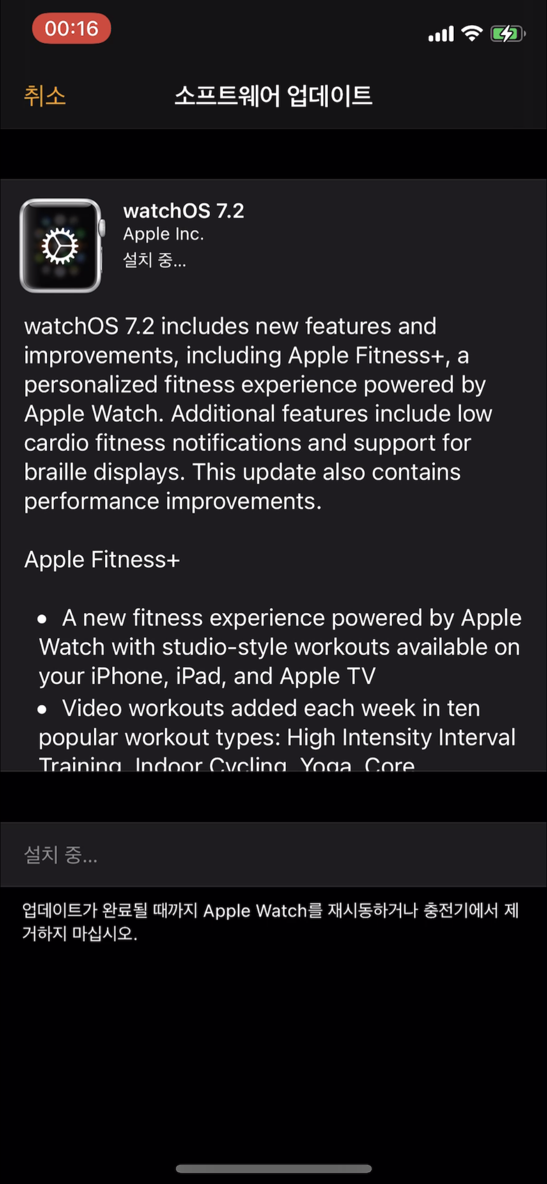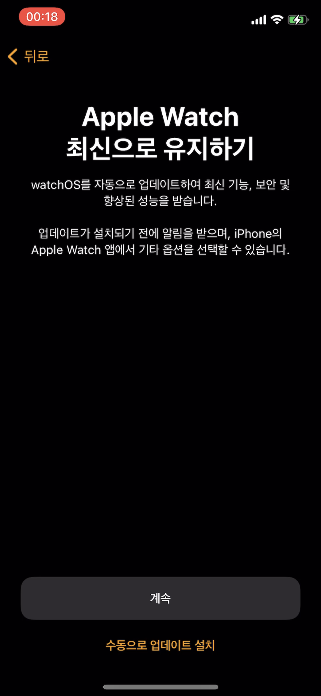 소프트웨어 업데이트시 주의해야될 사항은 1. 아이폰을 와이파이에 연결하고 2. 애플워치가 충전 중이어야 한다는 것입니다. 이걸 모르고 있으면 소프트웨어 업데이트를 시작하지 않더라구요. 자동으로 업데이트 되는 줄 알고 20분을 멍때렸는데 한참이 지나도 시작을 안하길래 차근차근 읽어보니 위와 같은 주의사항을 지켜달라는 안내가 영어로(!!!) 되어 있었습니다. 아이폰을 와이파이에 연결하고 애플워치를 충전 독에 올려두니 소프트웨어 업데이트가 진행되었습니다.