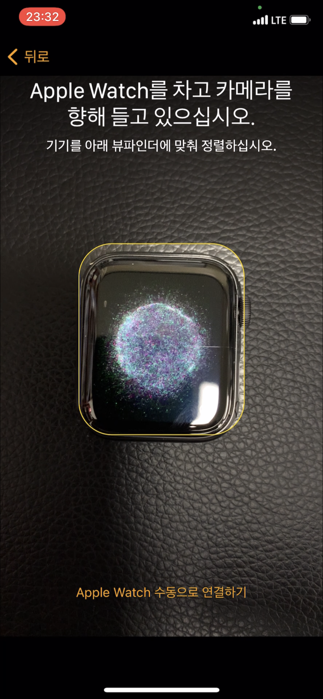 설정이 시작되면 카메라가 작동하면서 가운데에 시계 디스플레이 크기만큼의 활성 영역(뷰파인더)이 생깁니다. 동시에 워치에는 아이폰이 워치를 인식할 수 있도록 특별한 애니메이션이 나타납니다. 뷰파인더에 애플워치를 인식시키면 자동으로 연결되면서 소프트웨어 업데이트로 넘어가게 됩니다.