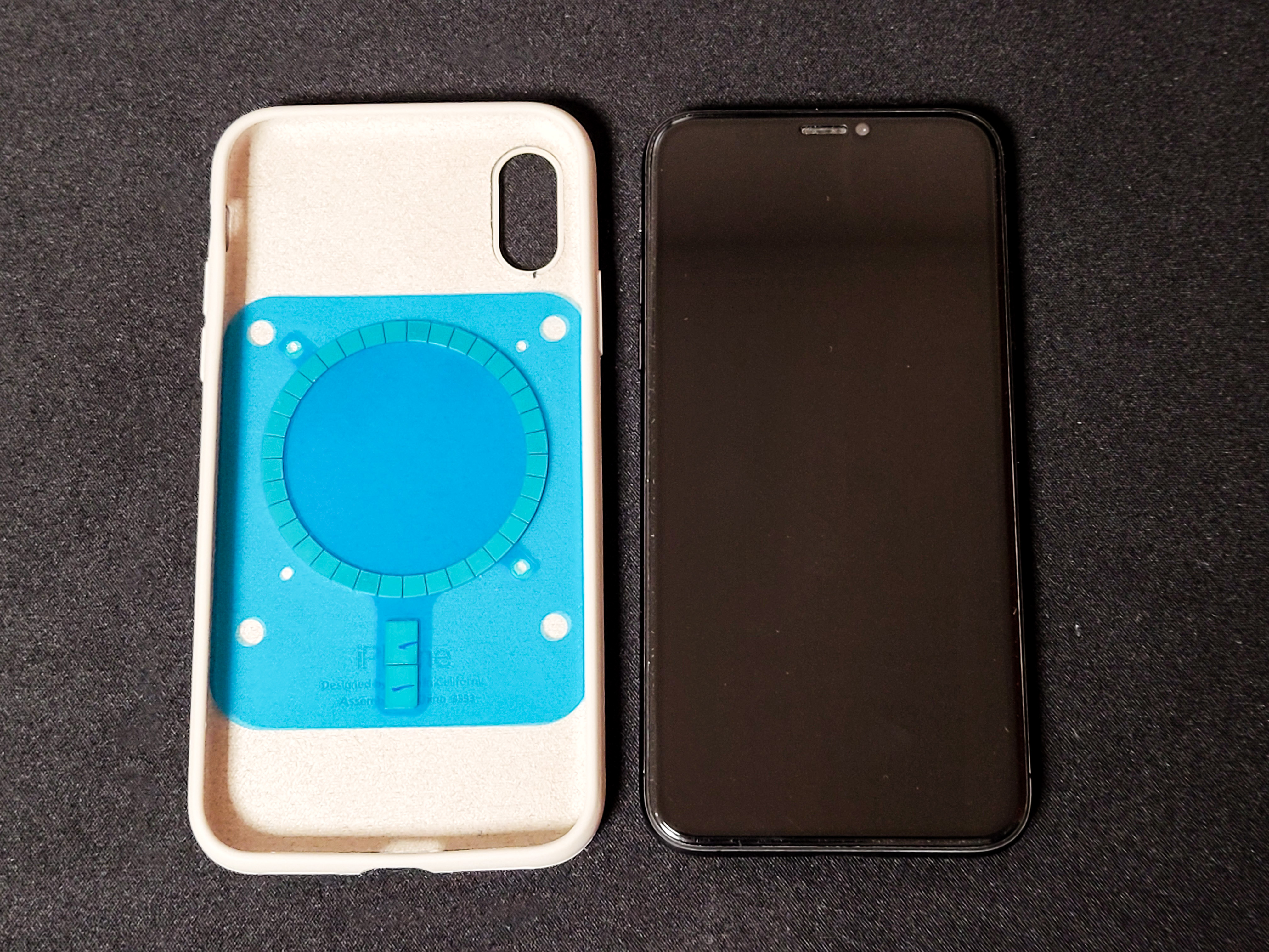 우선 개봉기에서는 맥세이프 자석 스티커를 이용해보겠습니다. 실리콘 케이스 내부에 자석이 잘 위치하도록 한 뒤 케이스를 씌워봅니다. 이때 자석의 위치는 아이폰XS의 무선 충전 코일과 일치하도록 위치를 잡는 것이 좋습니다. 아이폰 XS의 무선 충전 코일의 위치는 다음 그림과 같습니다.